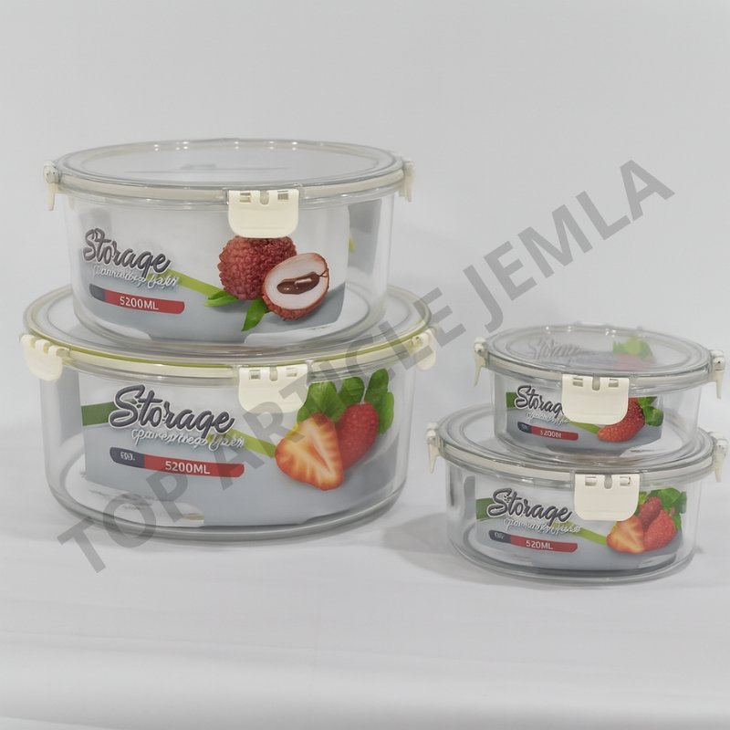طقم عملي مكوّن من 4 علب حفظ الطعام مستديرة بأحجام متعددة مع أغطية محكمة الإغلاق. مثالي لتخزين الطعام، الفواكه، الشوربات أو الوجبات الجاهزة، سواء في الثلاجة أو المجمد.