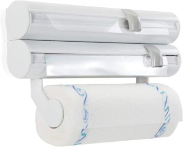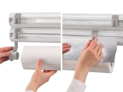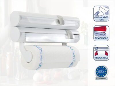 - Capacité/Contenu : Jusqu’à 3 rouleaux (papier alu, film alimentaire, essuie-tout).