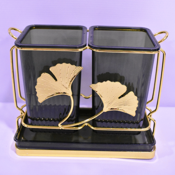 Design raffiné → Gobelets translucides nervurés (gris-vert) et cadre métallique doré orné de feuilles de ginkgo, apportant une touche chic à votre cuisine.